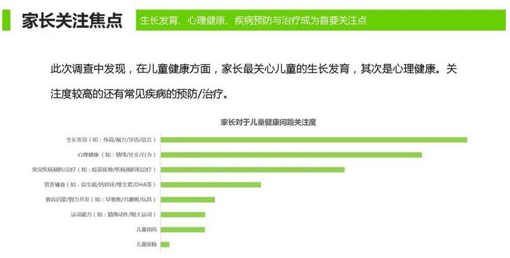 調查發現,在嬰童健康方面,家長對嬰童的生(shēng)長發育關注度最高,并且,超過65%的家長帶孩子做過嬰童保健。這表明,家長們對嬰童的健康問(wèn)題普遍重視,且對嬰童保健具有巨大(dà)的消費需求。